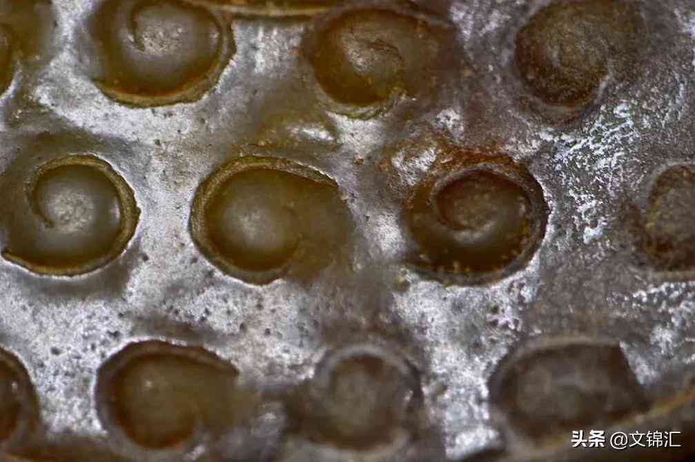 汉代谷纹。这种谷纹的工痕切削有力,几乎看不到砣痕大有削铁如泥的感觉,是春秋至汉代兴起的一种工痕。刀起刀落均可见砣痕运转的痕迹,皆是斜着走砣婉转自如绝不拖泥带水,四周有减地时留下凹凸的深墙,谷纹如同豆芽一般分明有致。