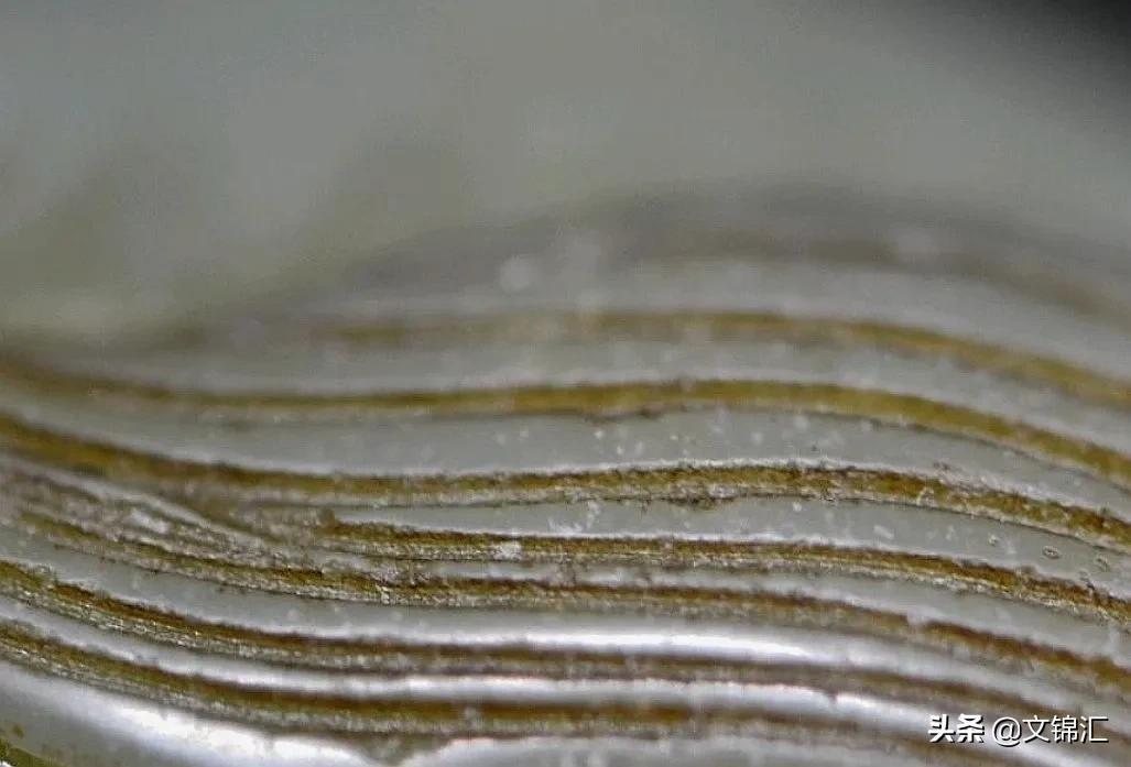 仿明代玉器细部图。初看与上图阴线几乎一样,细看内外包浆不一,底槽平行无深浅变化,线条有缺口,虽然古砣痕中也有磞茬现象,但不会有这种大块的磞口。