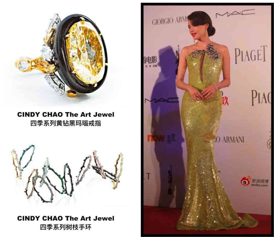 而当初舒淇艳压金马、成为RCFA年度“全球最美红毯top20”那套深V大露背礼服装,搭配的也是CINDY CHAO秋枫手环及戒指。