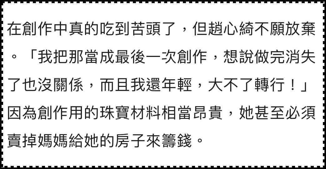 可Cindy Chao却透露在品牌创立初期,因为宝石用价和创作难度过高,一度被迫变卖母亲给的房产来维持运转……
