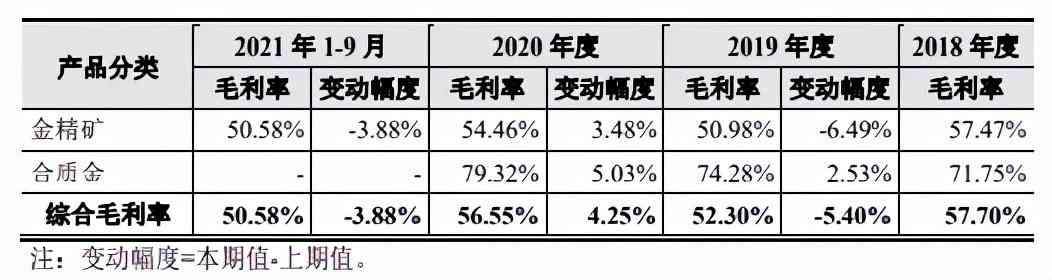在成本上升的同时,毛利率总体上呈下降趋势,综合毛利率由2018年的57.70%下降到2021前三季度的50.58%。金精矿的毛利率由2018年度的57.47%下降到50.58%。