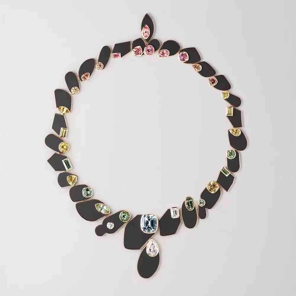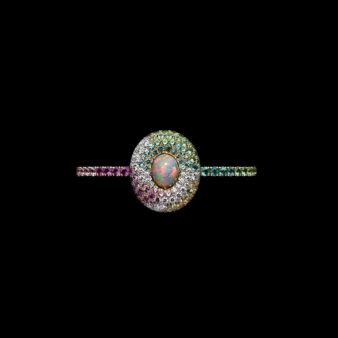 在这一方面,华人珠宝设计师 Cindy Chao 探索不止。每每看她的作品,我们可以注意到自然卷曲的造型、大大小小排布的钻石和宝石,几乎看不到金属部分。借助金属的高硬度,Cindy Chao 有意缩小了镶爪,降低了金属的存在感,各色宝石组合起来构成了一幅立体的“晕染画”。