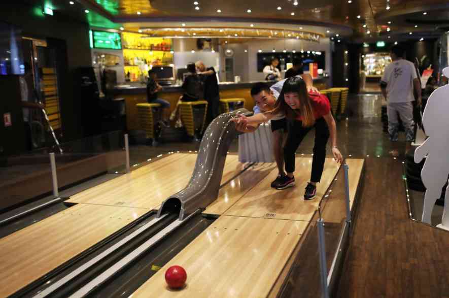 我和我老婆还次玩了保龄球,我觉得挺好玩的。我一直很喜欢这种靠准确度的游戏,以前我玩打气球,一次十五发全部打中,我挺擅长这类游戏的。没想到玩保龄球时,我老婆误打误撞,居然打出全中的成绩,把我给赢了,她非常开心。