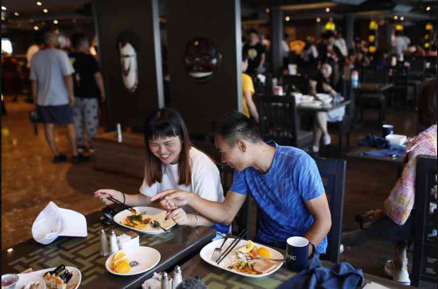 让我们夫妻俩印象最深刻的是船上的餐厅,都那么大。自助餐想吃什么就拿什么,海鲜各式各类,虾,淡菜,鱼都有,挺合我口味的。