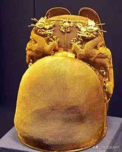 比如,明代万历皇帝的金丝蟠龙翼善冠,这顶金冠重量仅有826克,冠顶处缀有游龙戏珠图案,由518根0.2毫米的金花丝,编织成一层细密的冠身,触感薄如轻纱,足以见得当时工艺之高超。