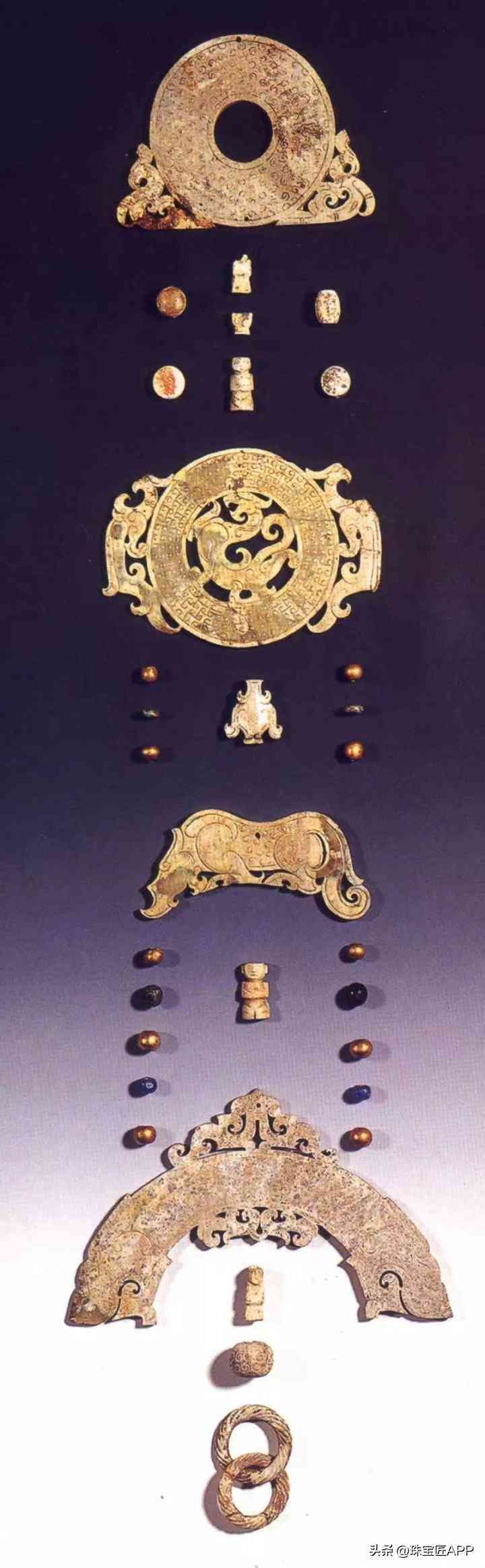 另一种是贵族阶层佩戴的组佩,这种组佩不仅单个玉饰精美无比,而且串联方式也非同寻常。