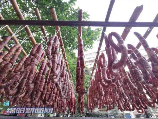 临近年底,正是市民制作香肠、腊肉的消费旺季,何女士肉铺前的竹架上也挂满了顾客加工好正在风干的香肠。
