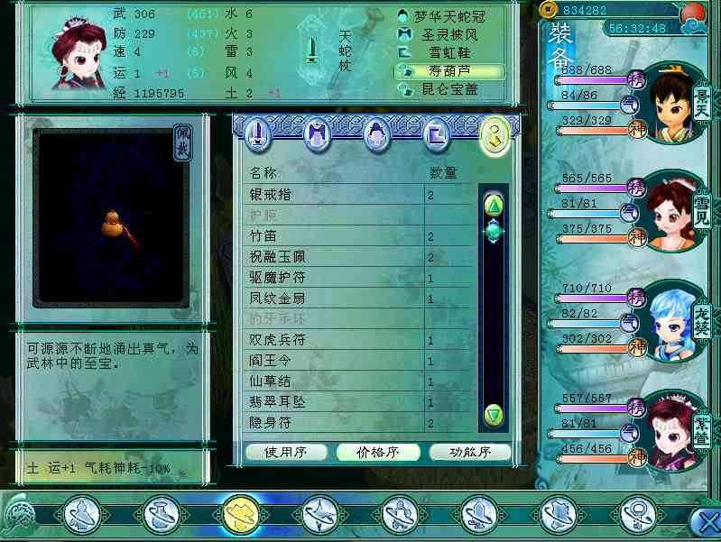 寿葫芦:土属性、+运1,气耗神耗-10%,售价25000文。
