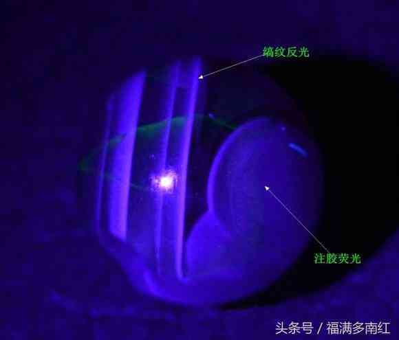 3、借助一些仪器,如紫光灯来照射鉴别。真空注胶造假的南红玛瑙在紫光灯的照射下会有荧光反应,这也是胶水与天然南红玛瑙质地构成不同的原因所致,推荐使用365波段紫光灯。(395紫光灯下部分注胶荧光会与白色缟纹反光混淆,难以判定。)