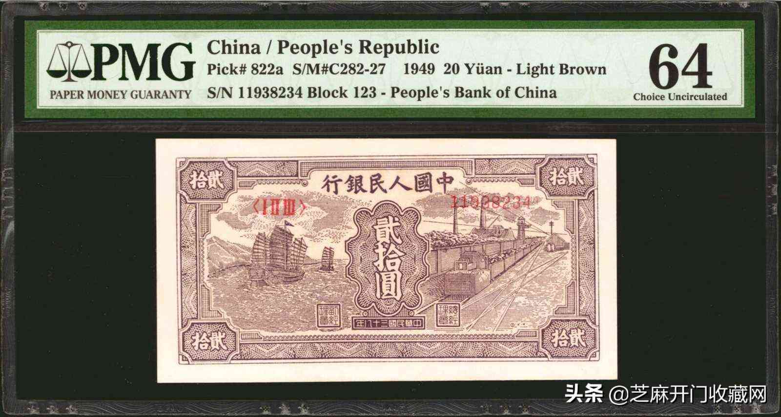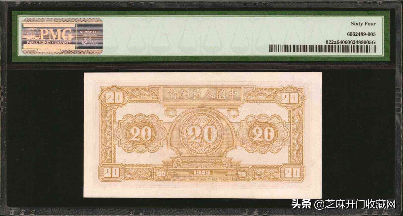 1949年版人民币贰拾圆 PMG Choice Unc 64,估价: USD 4000 – 6000,成交价格: USD 7800
