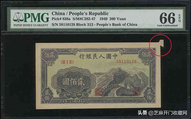 1949年一版人民币200元「长城」,右上褔耳错票,PMG66EPQ,非常罕有,成交价格: HKD 54000