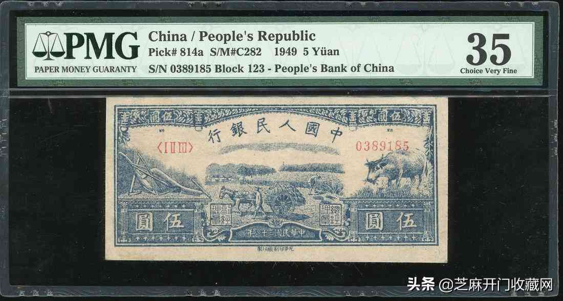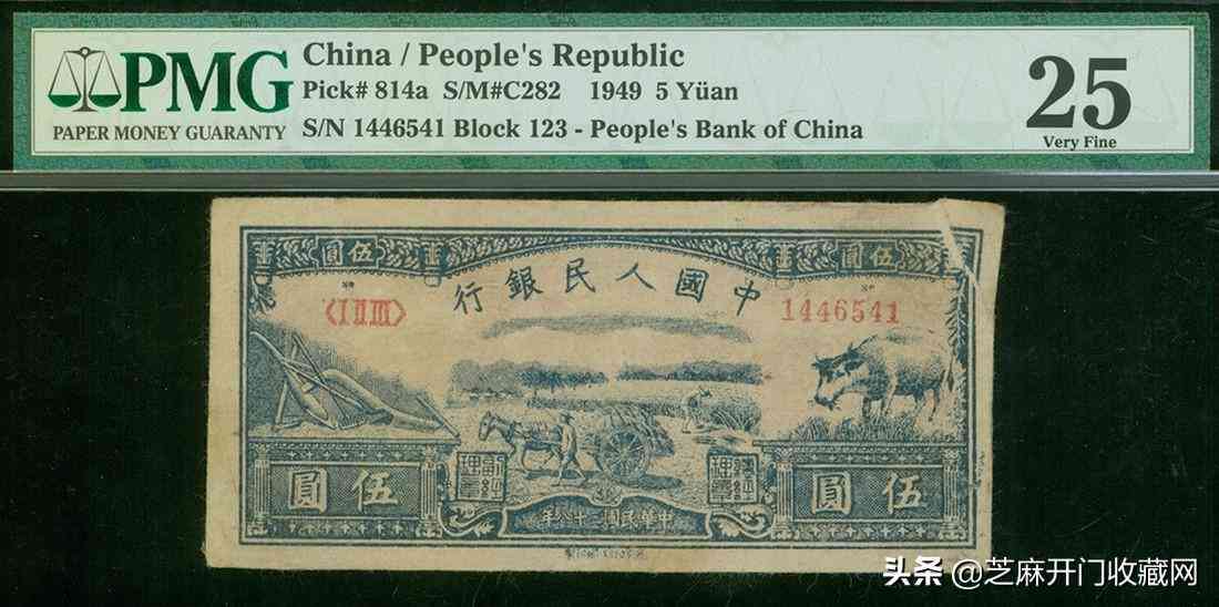 1949年中国人民银行一版人民币5元(水牛图), 右上边摺白错体内, PMG25, 罕有,成交价格: HKD 55200