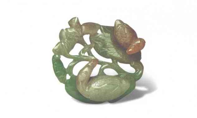 而翡大多生长在玉材的外表皮处,翠在玉材的里面,所以常被工匠们做成了巧雕。如图中清代翡翠雕荷塘鸳鸯佩就是利用了颜色的不同进行了巧雕。红翡雕刻成鸳鸯,绿翠刻雕成荷叶,形象而又逼真,给人以活灵活现的感觉。