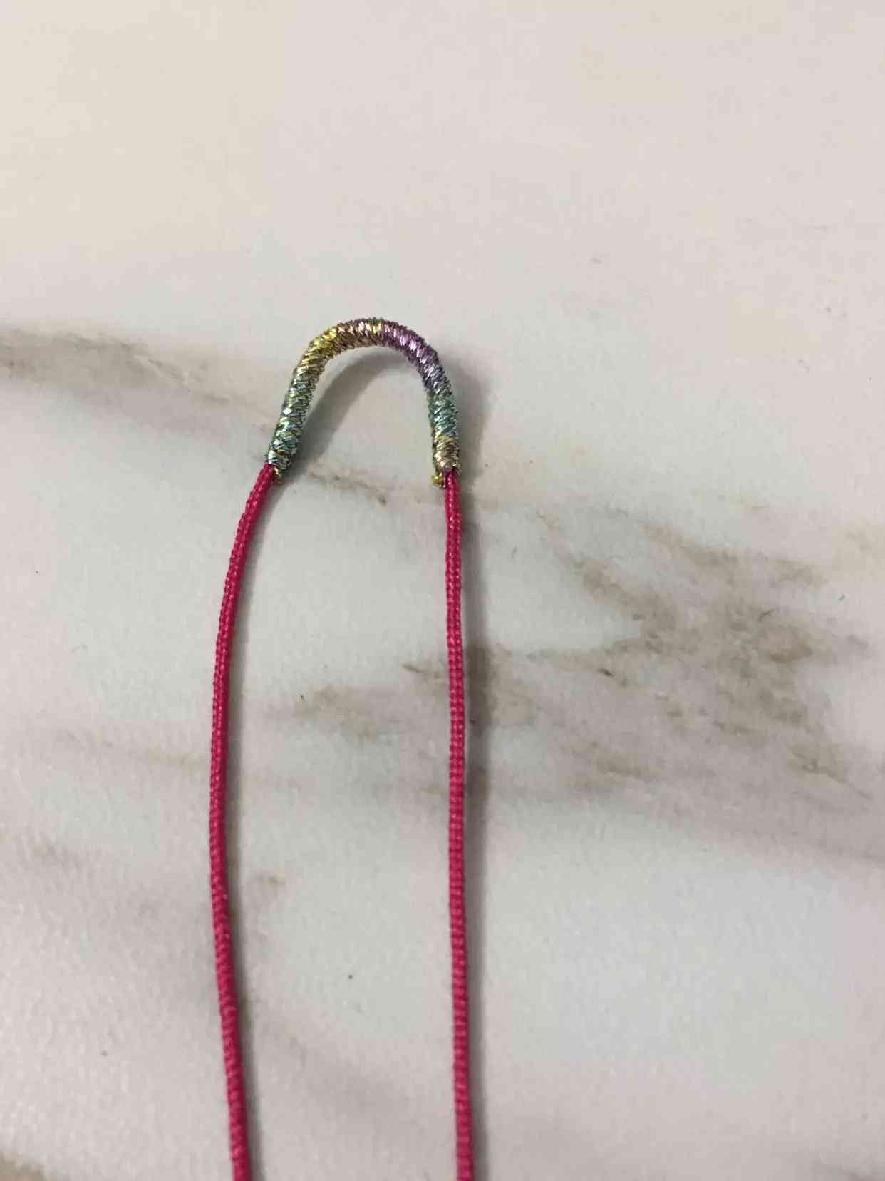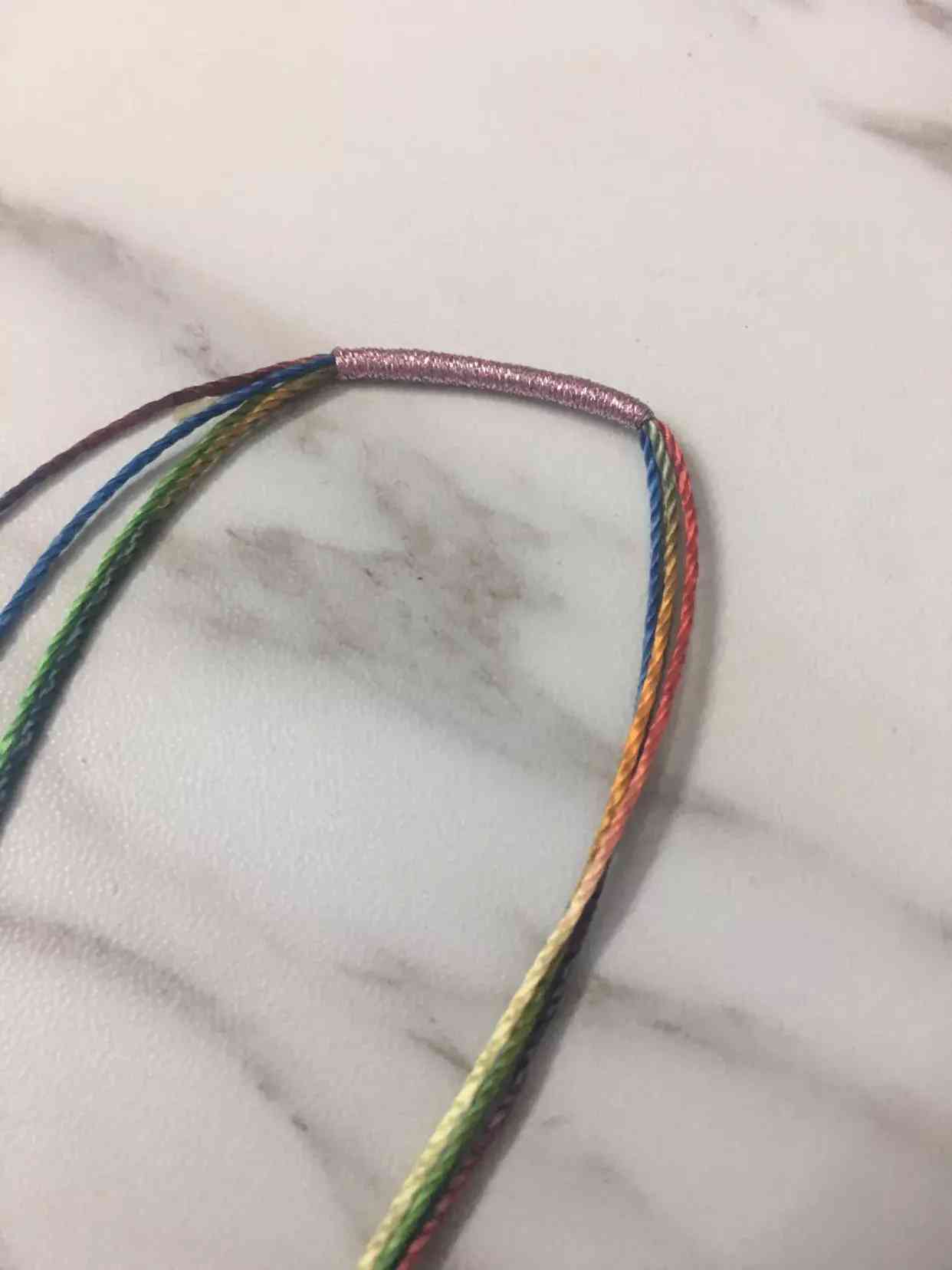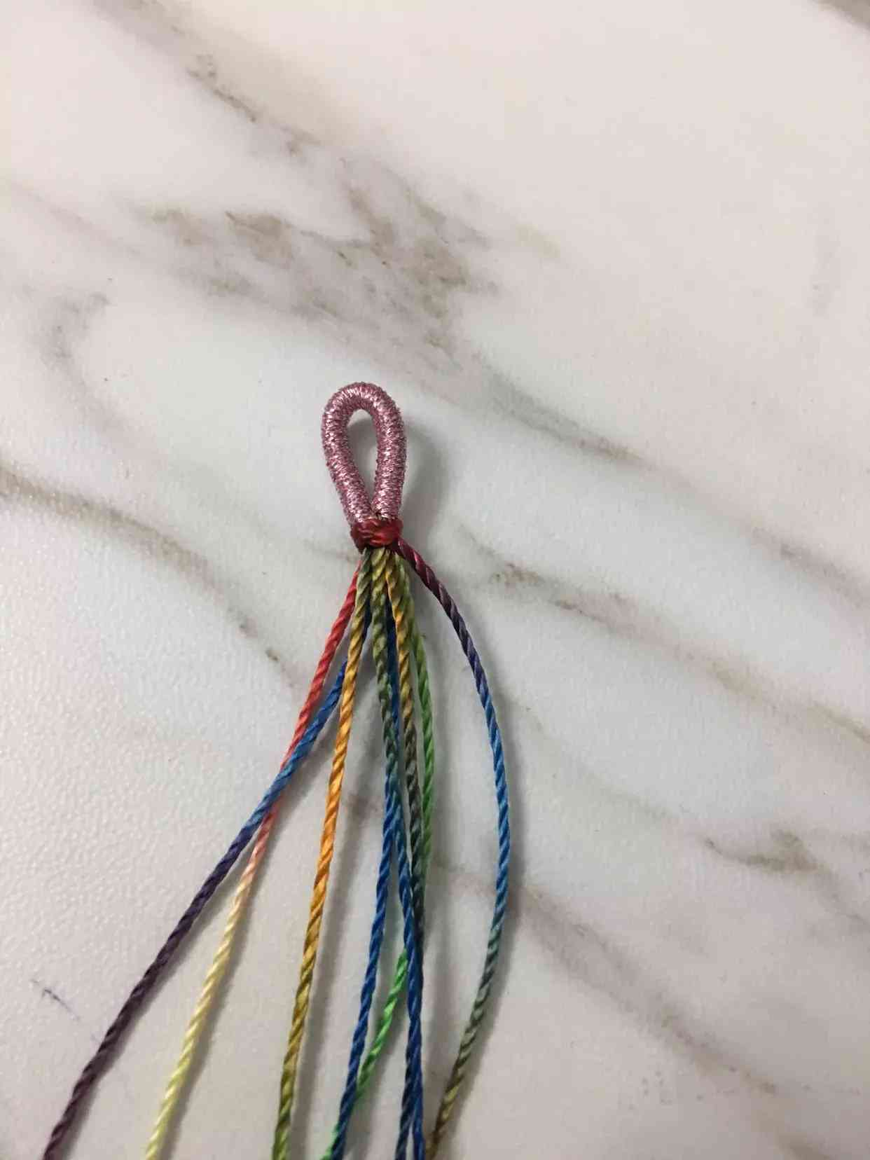 准备四条长度为80厘米的9股五彩线,从中间对折后用浅紫金线编一段绕线,长度为2厘米。