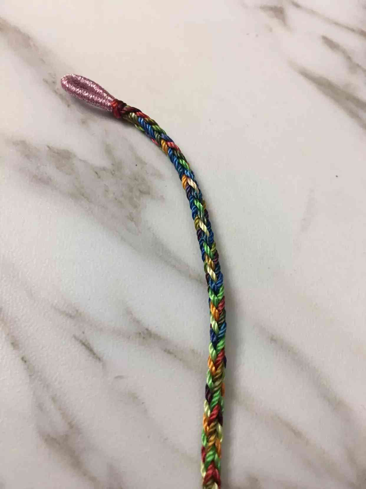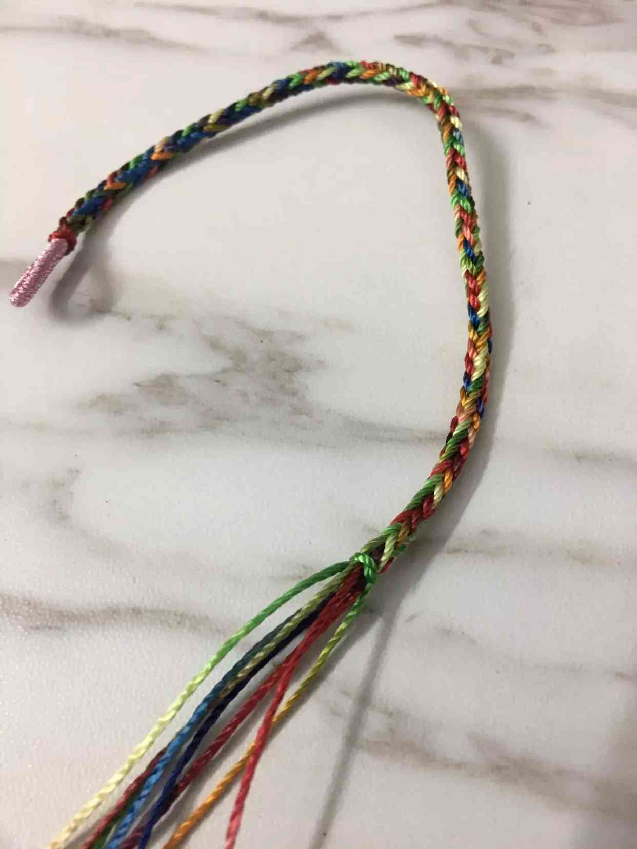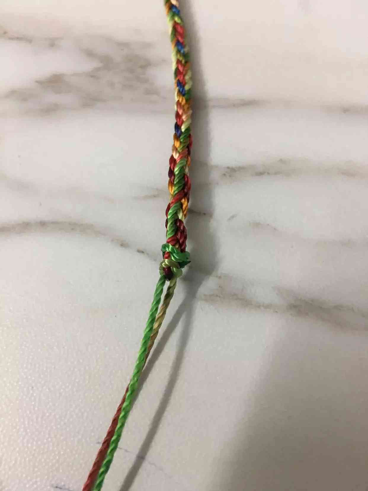 编织到所需长度以后,和开始一样的方法,用其中的两条线把前面那条线编织起来做一个包线金刚结。