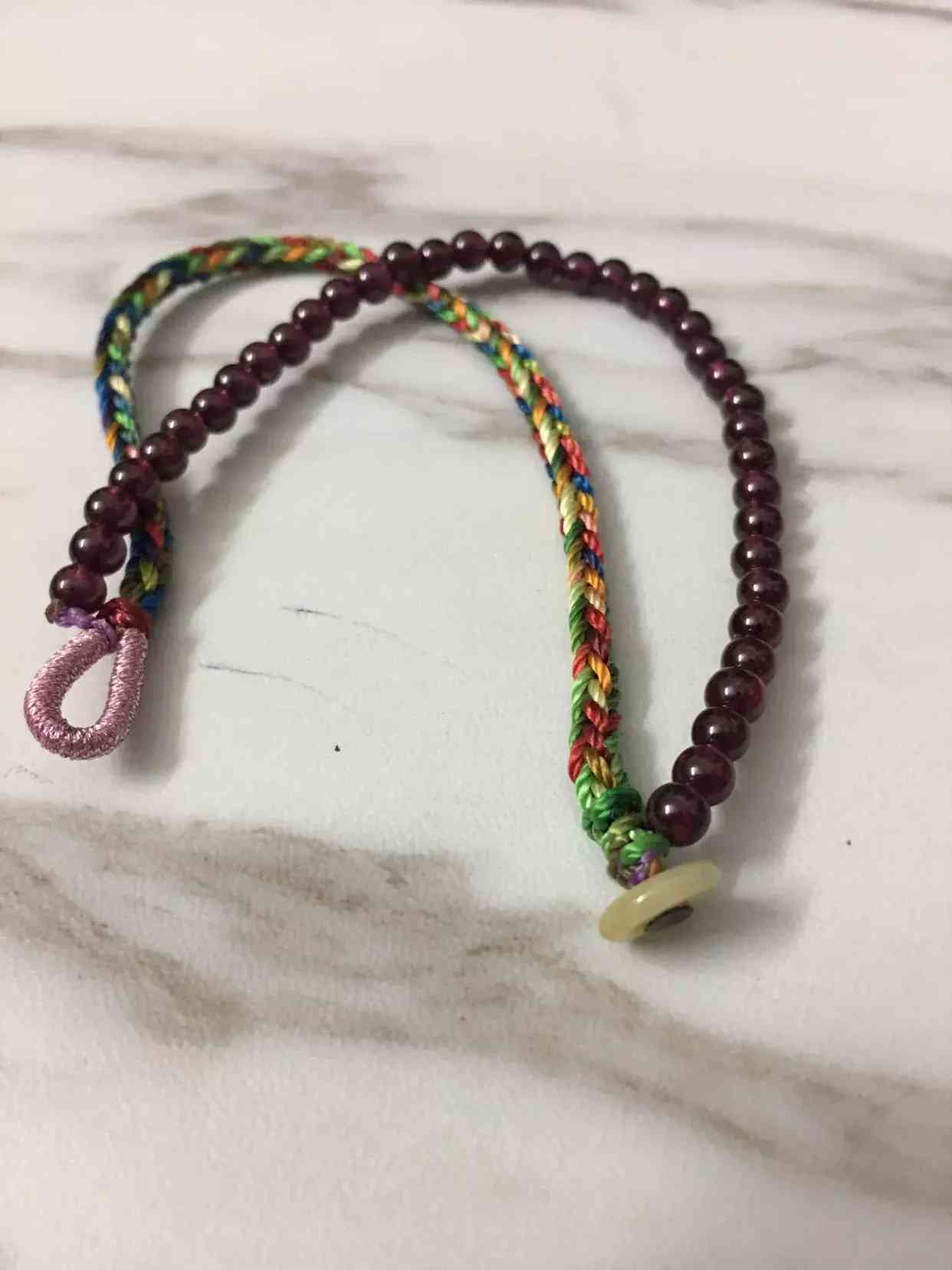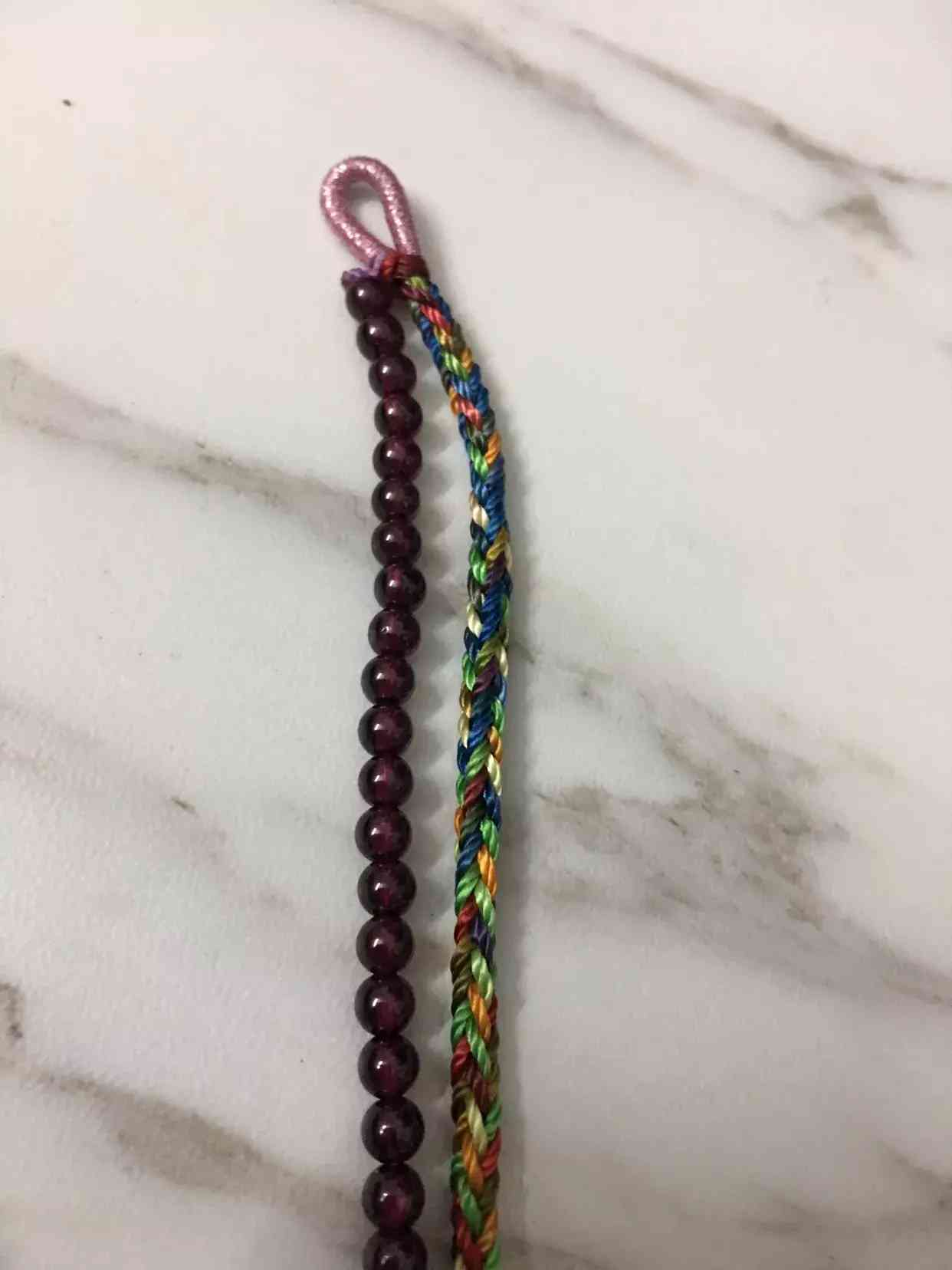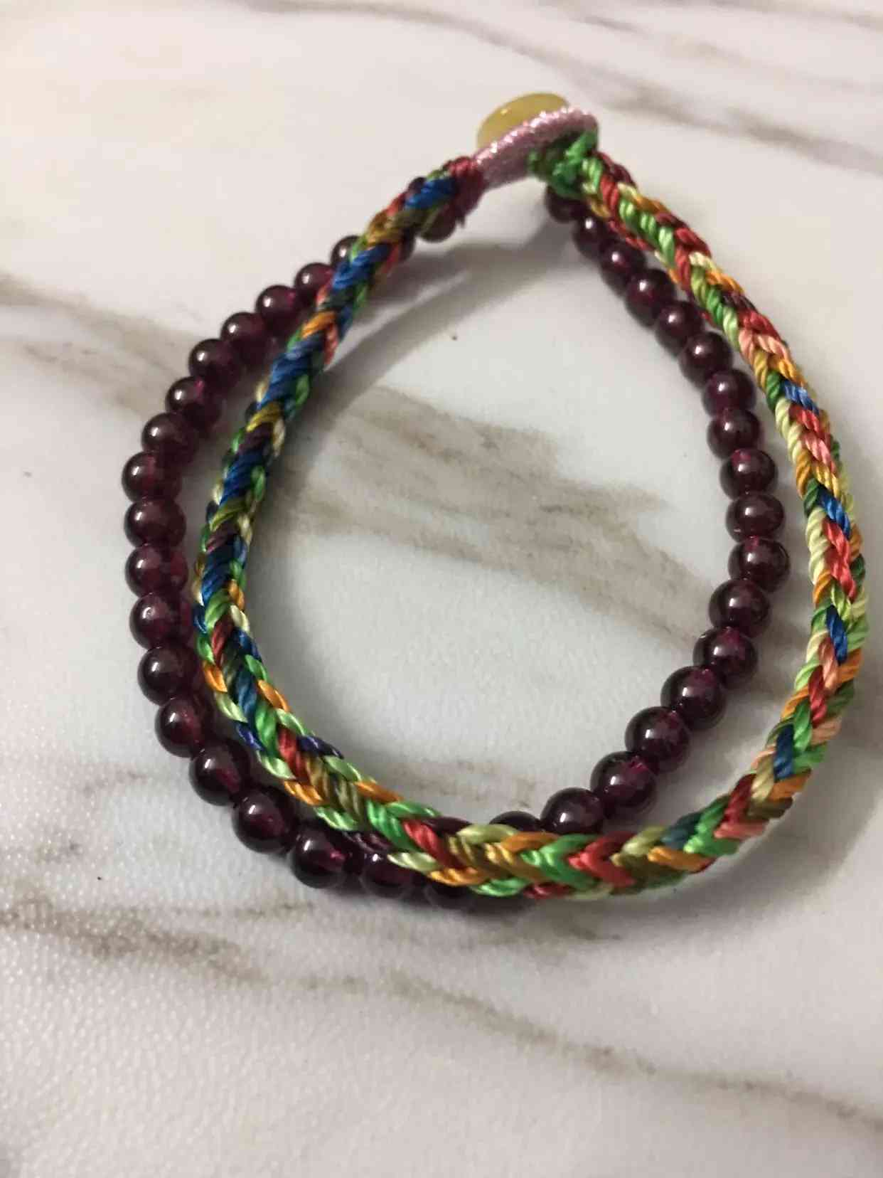 想不出太多的款式,下班后回到家时间也很赶,遂今天简单地用八股辫以及石榴石做了这款手绳,虽然编法步骤简单,但出来的效果却很精彩。石榴石的紫红配上五彩绳的光彩相得益彰。