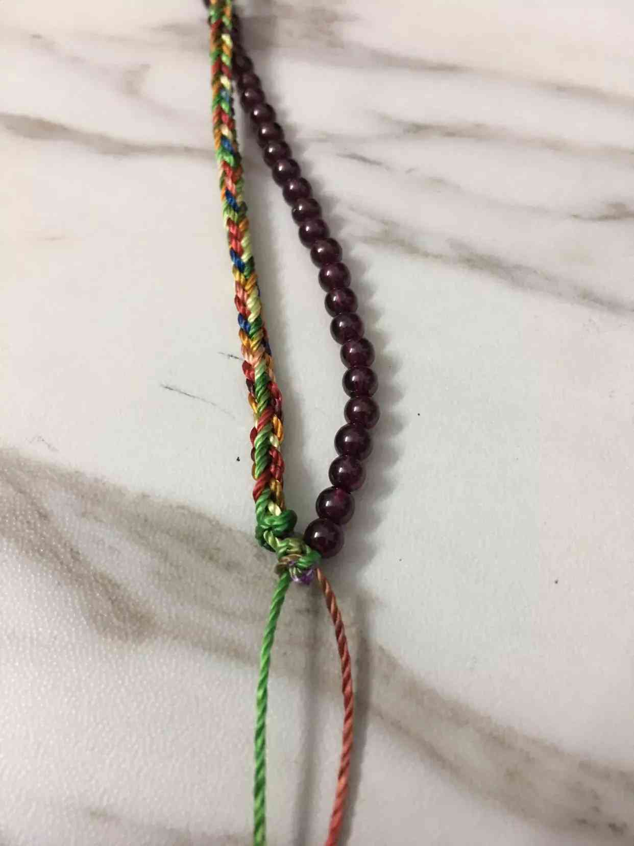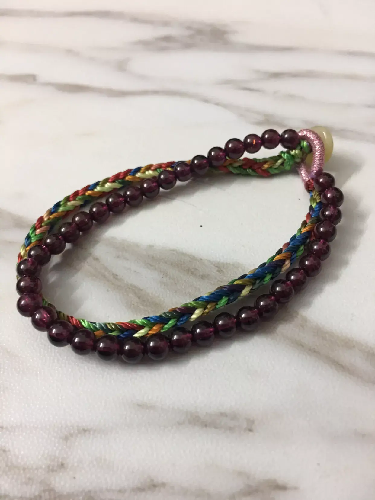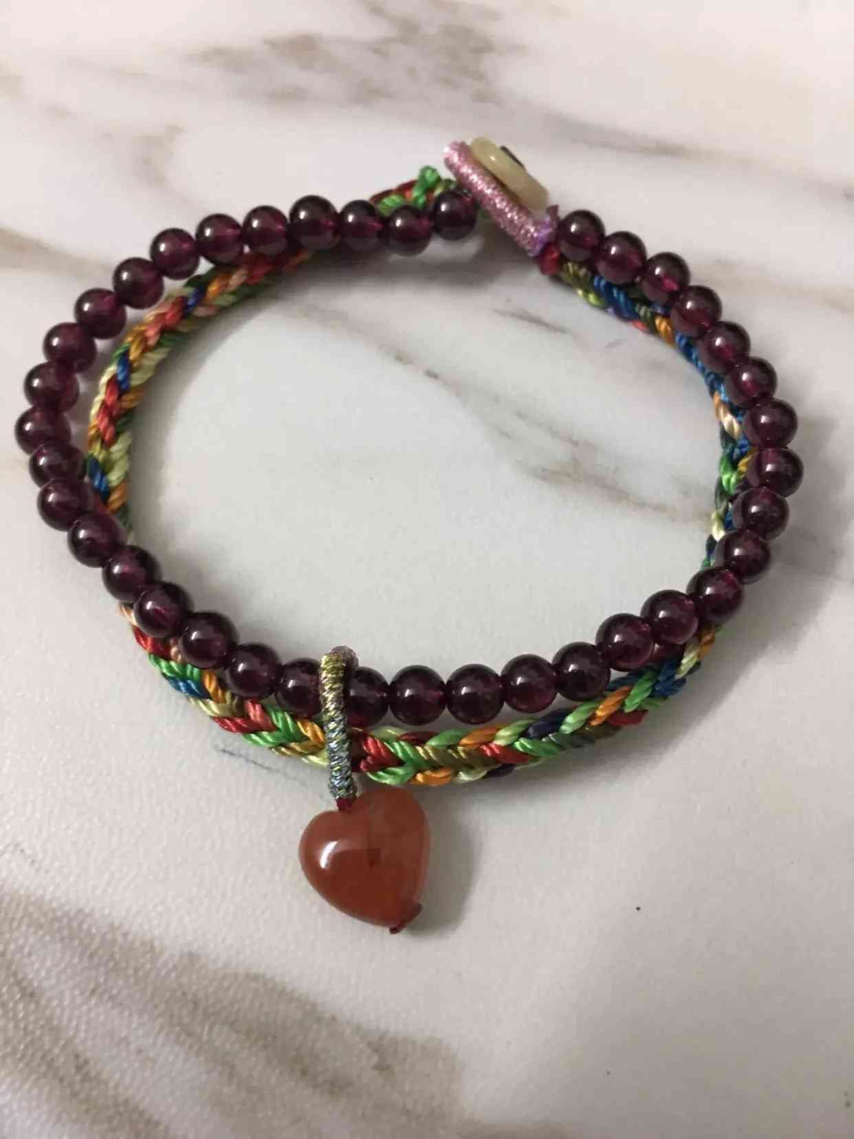 想不出太多的款式,下班后回到家时间也很赶,遂今天简单地用八股辫以及石榴石做了这款手绳,虽然编法步骤简单,但出来的效果却很精彩。石榴石的紫红配上五彩绳的光彩相得益彰。