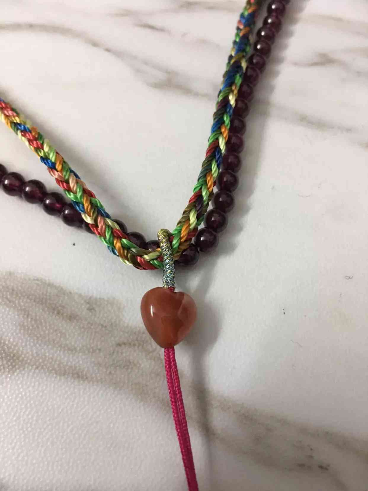 穿过手绳之后,再穿过一颗南红的心形坠子。