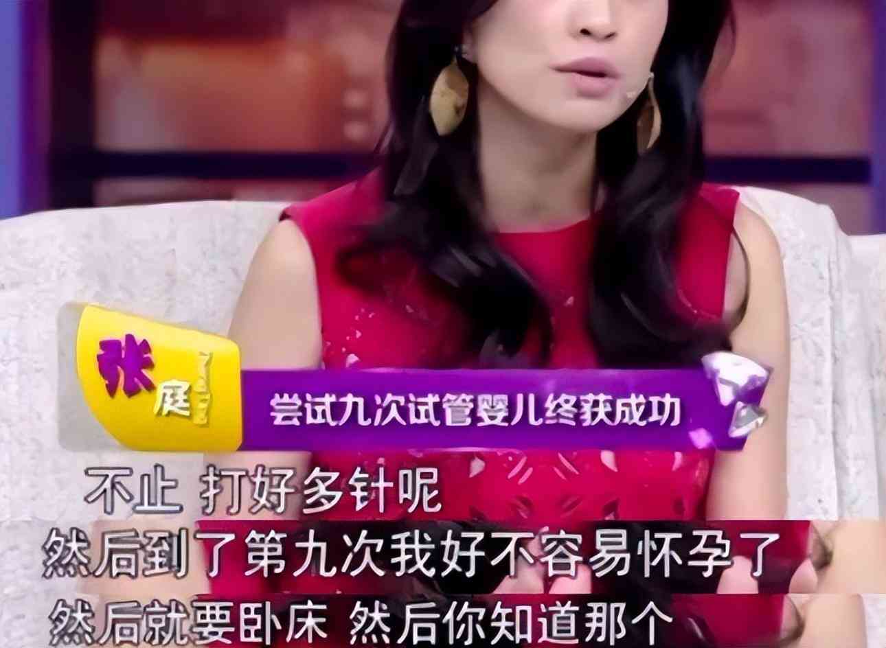 结婚后,为了生孩子,张庭吃尽苦头,因为无法自然怀孕,他们只能做试管婴儿,张庭说,三年时间,她打了一千多针,孕期为了保胎,一段时间甚至靠在屋子里爬行活动,这才有了两个孩子。