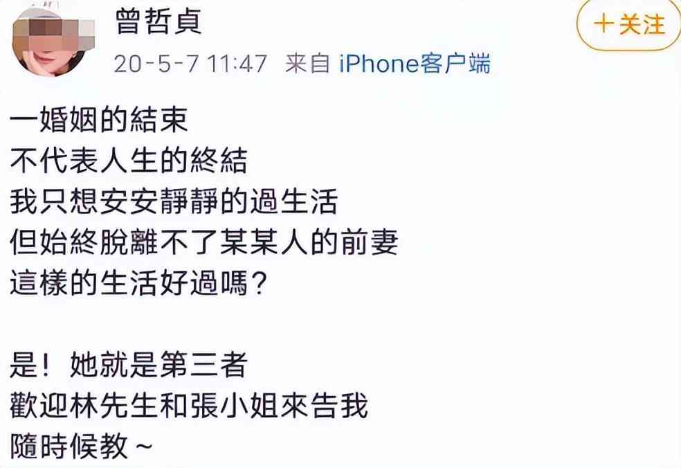 或许是因为林瑞阳和张庭秀恩爱,秀孩子,太过高调,却对前妻的两个孩子不闻不问,据说,前妻的儿子连爸爸的微信都没有,2020年5月份,曾哲贞发微博开撕,“她就是第三者,欢迎林先生和张小姐来告我。“