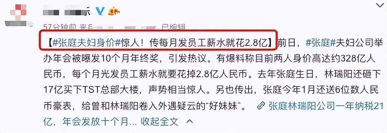 每个月,张庭光给员工发薪水就要2.8亿,2018年一年,他们纳税21亿的新闻还上过热搜,她到底赚多少钱,大家可以自己算。