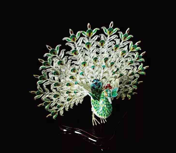 上图为以银为胎器的烧蓝工艺制作的孔雀