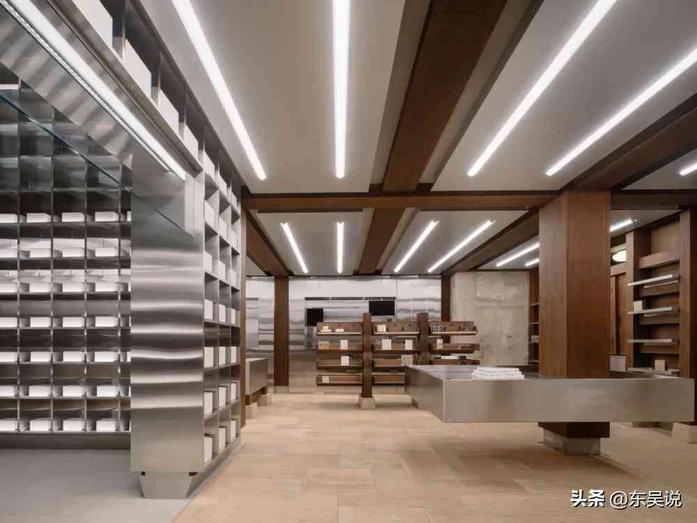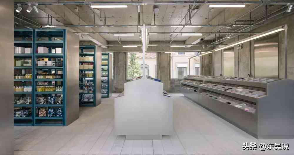 一层的室内的陈设和家具大量使用了厚重的石墩和深色的木材,货架和展示岛的排布唤起了人们对于街角商店的记忆。二层的形象较之一层则更加保守,通过阵列的仓储钢架呼应了品牌的历史。位于阁楼的空间一半是后仓,一半是面向公众开放的露台,占主导地位的垂直仓储结构与古老的木质屋顶形成了鲜明的对比,丰富了时间维度的层次表达。