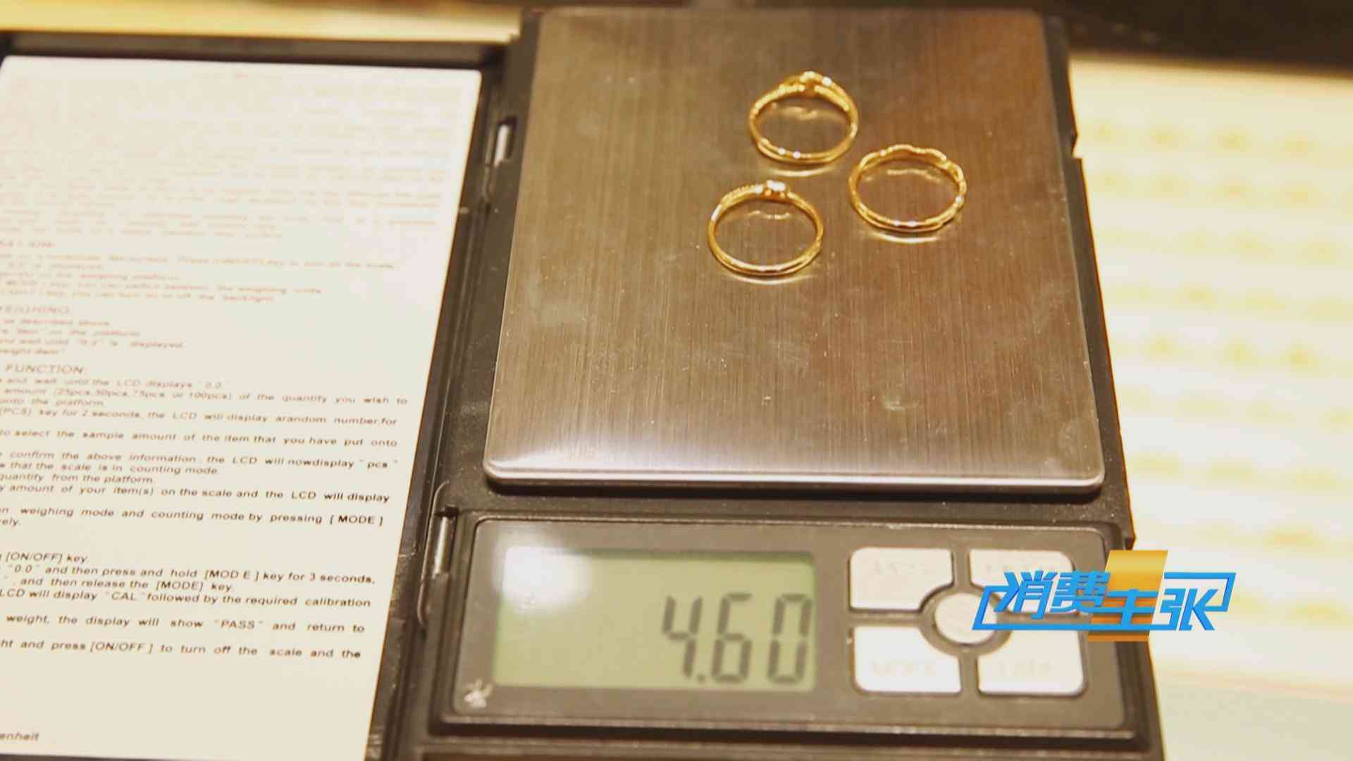 这枚5G黄金戒指重量只有1.48克,记者又连续放了两枚,一共三枚5G黄金的戒指,总重都没有超过5克,只有4.6克左右。