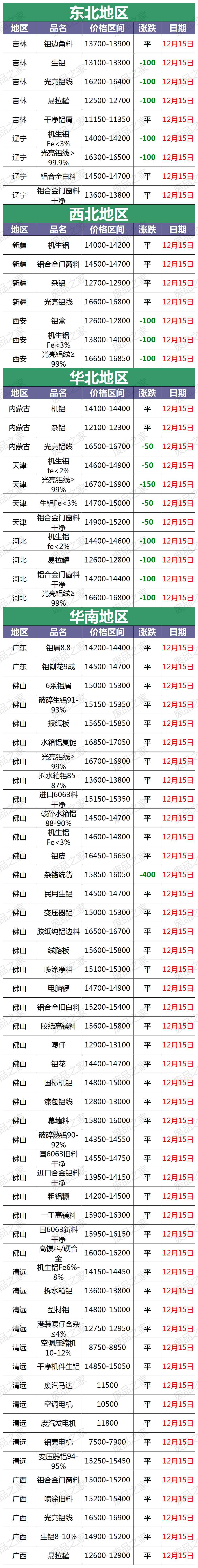 12月15日起,河南长葛协盈金属废铝采购价:大件生铝13900-14300,机械生铝15900,通料生铝12700-13100,活塞14400-15000,摩托圈14800-15100,新白件14500-15200,ADCl铝屑14300-15000,6系铝屑14300-15000。