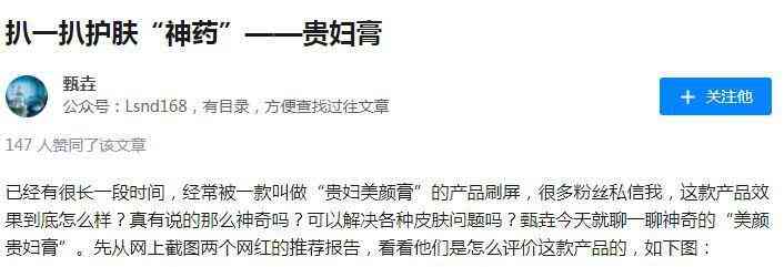 此外,林子还发现,在微信公众号、知乎上有不少自媒体发文称,号称可以一瓶解决皮肤多种问题的“贵妇膏”,其实就是升级版的素颜霜。