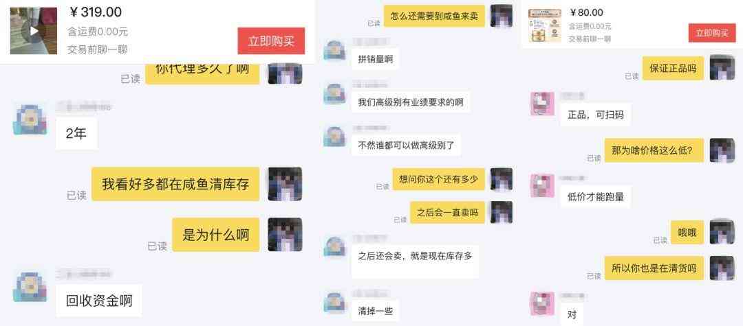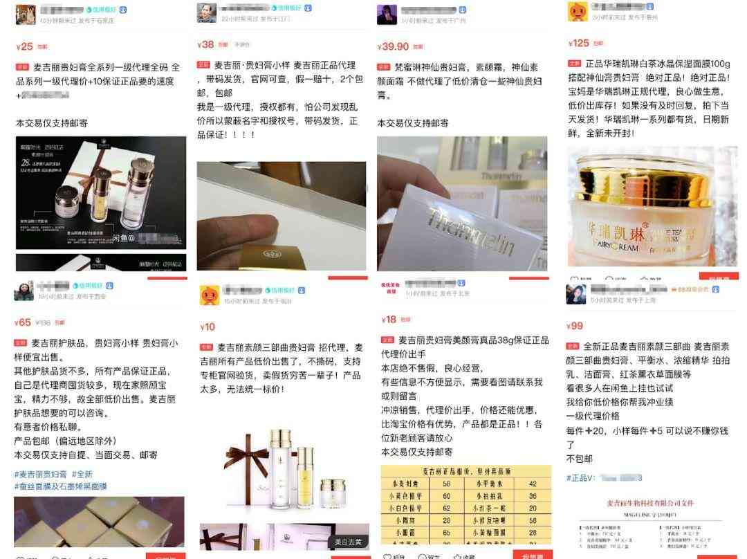 而在闲鱼上,却有大批的“贵妇膏”正在清货甩卖。不少原价一千多的“贵妇膏”都以一级代理的价格出货,很多还是不撕码的。林子以普通消费者的身份随机询问了几位卖家,她们的身份分别为高级代理、总代和总监。其中一位高级代理告诉林子,高级代理有业绩要求,清货是为了拼销量以及回收资金,而自己手里还有许多货压着。