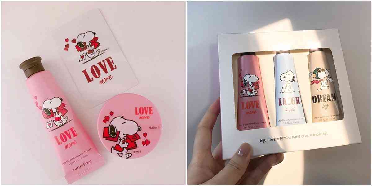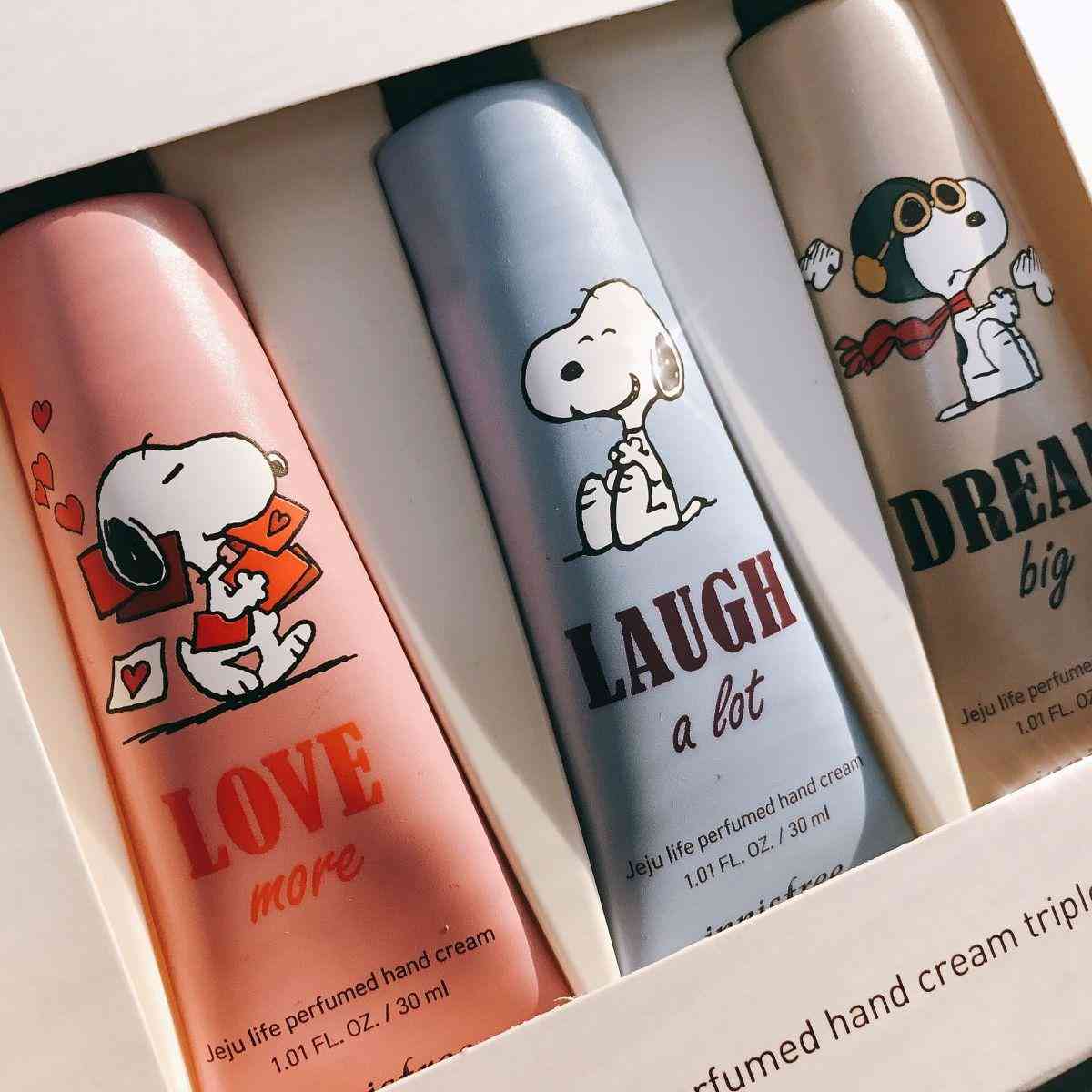首波推出的是保养组合,有innisfree的明星保养「innisfree X Snoopy济州香氛护手霜组(1组3款)」,三款的香气分别是「婚礼的花束(花香调) 四月」(粉红)、阳光下的山草莓 (果香调) 五月(蓝色)、秋季小雨(麝香) 十月(米棕),三款的史努比都有不同造型,超可爱!