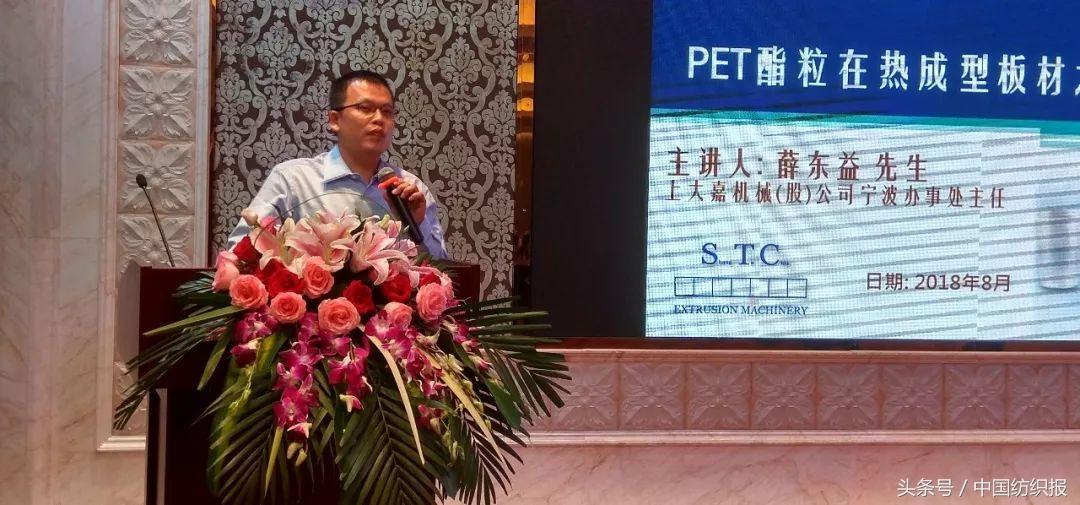上大嘉机械(股)公司宁波办事处主任薛东益讲述的是《PET酯粒在热成型板材之应用》。据介绍,1976年杜邦公司开始将PET用于生产饮料瓶。这种材料具有的特点如下:,优良气体阻隔性、耐压性、耐冲击性、透明性与表面;第二,无毒无味,容易加工且成品美观,广泛的应用在食品包材容器上;第三,制作过程无须添加增塑剂或添加剂,较环保且可以回收再制。