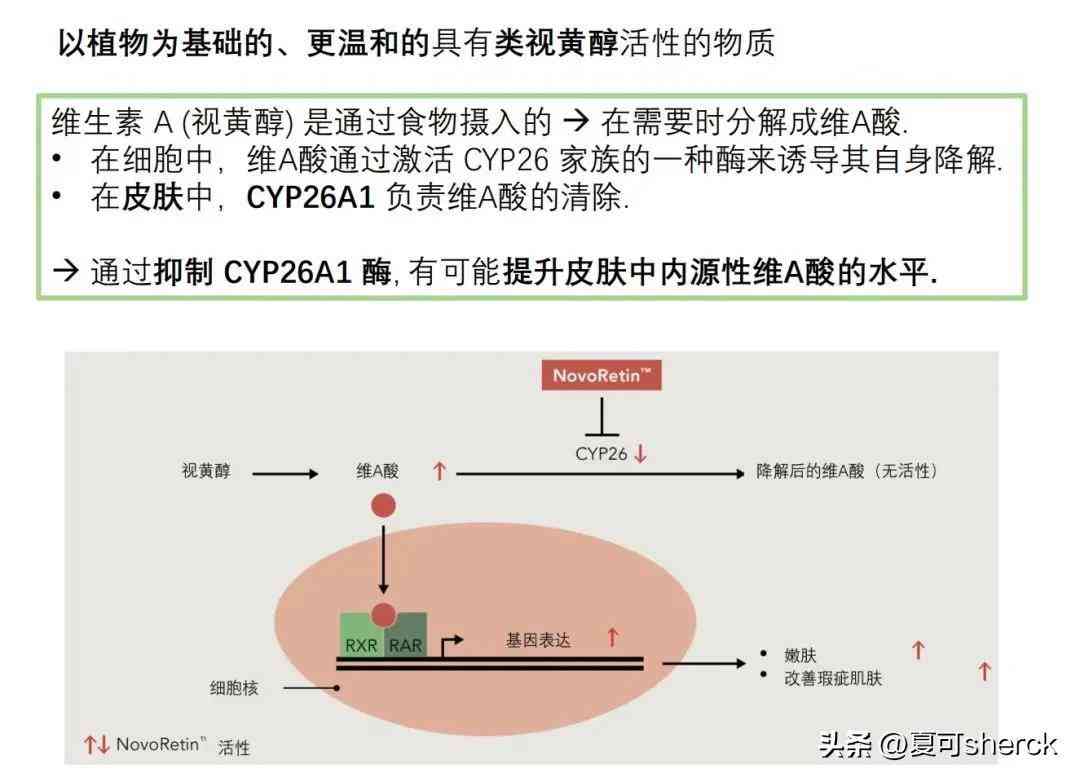 不同于其他针对RAR,RXR受体的原料,他的机理思路是帮助减少VA分解。本来皮肤里也有VA,他的存在是个生产与消耗的动态过程。