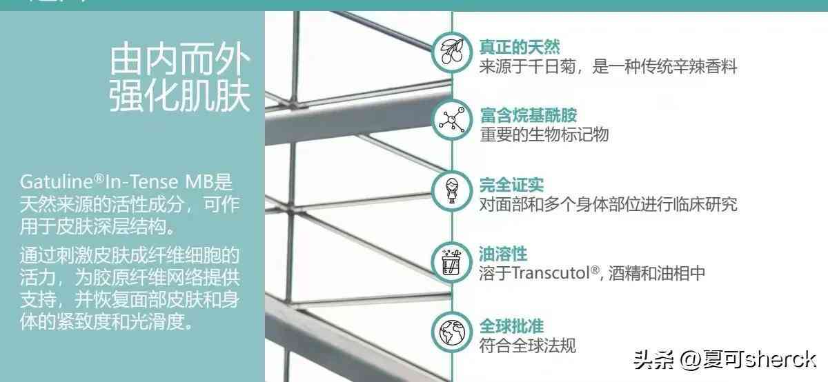 这个原料可以促进纤维母细胞活性,产生更多的胶原蛋白,并且还能帮助纤维蛋白结构紧缩,也就是紧致皮层,对抗松弛和淡化皱纹。