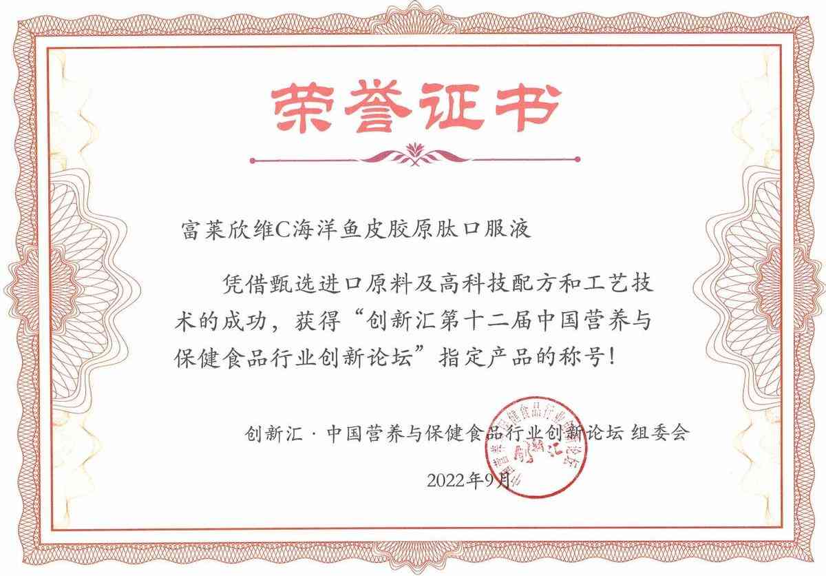 其中,近年来市场热销的富莱欣维生素C海洋鱼皮胶原肽口服液备受广大消费者推崇。凭借甄选进口原料及高科技配方和工艺技术的成功,获得“创新汇第十二届中国营养与保健食品行业创新论坛”指定产品的称号!