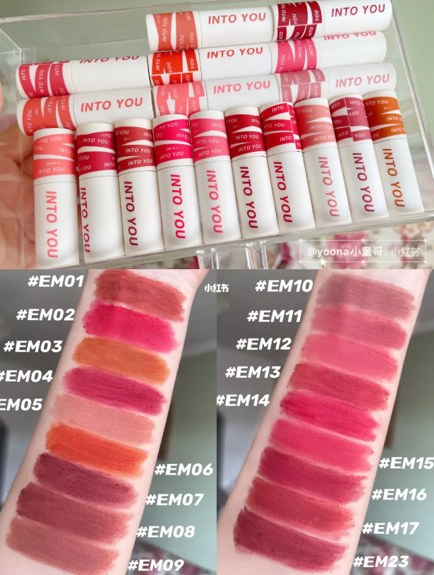 看这个试色是不是很心动,他们家的口红从配色到质地都价格真的是国货的天花板了,他们家就是以唇泥出圈的,在唇泥这块拿捏的死死的,还有很多新品薄泥、水光、折光唇釉等等,每个唇部彩妆都很出彩,大家可以自己去找找自己喜欢的颜色,总之intoyou家的唇部彩妆是我心中的名,也非常的适合学生党,各种各样的颜色总能挑到你爱的!