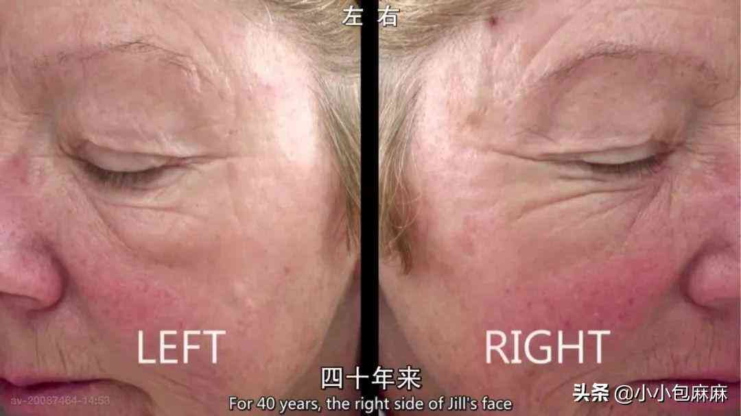 由于工作的原因,Jill的右脸长期暴露在阳光下,阳光中的长波紫外线UVA会穿透玻璃,加速了她右脸的衰老。