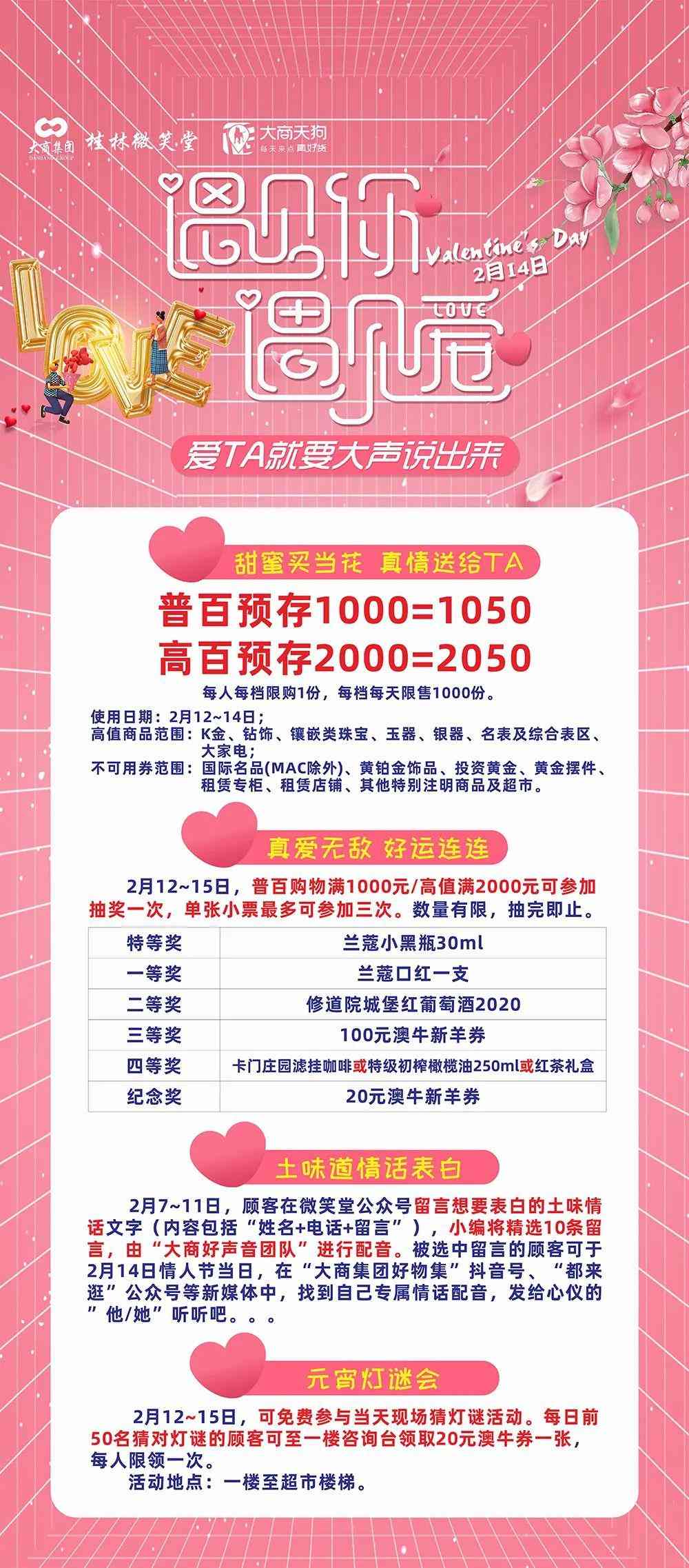 2月13日,在二楼少女馆购物满300元,可参与汤圆DIY并获赠汤圆一盒(限60盒)2月14日,在二楼少女馆购物满额享赠礼:当日购物满1800元送100g小重山红茶1罐当日购物满2500元送拉歌斯城堡波尔多红葡萄酒1瓶当日购物满3000元送拉歌斯城堡波尔多2018年红葡萄酒1瓶当日购物满3500元送MAC口红1支(以上礼品数量有限,送完为止)