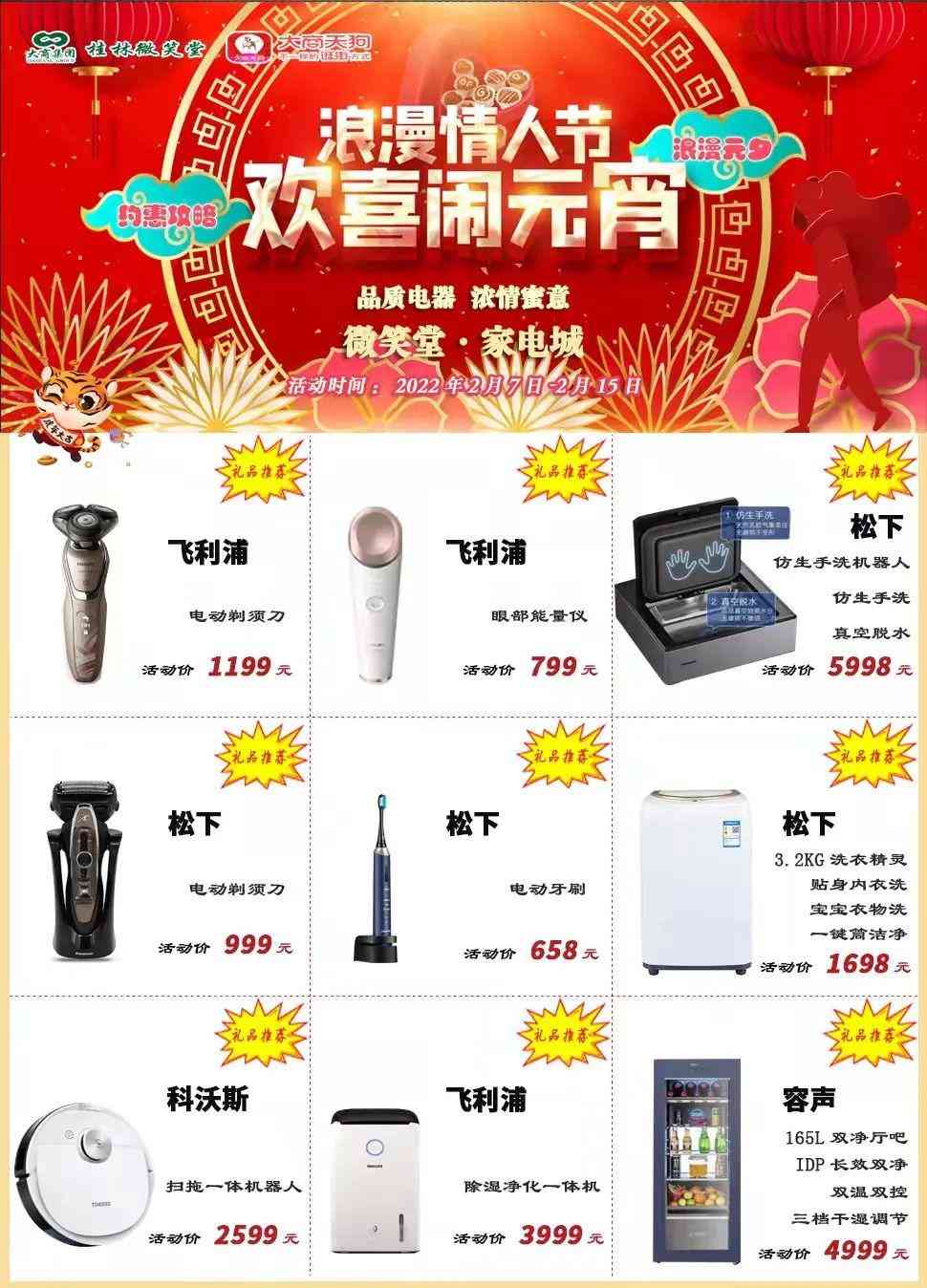 超市:购买湾仔码头、利口福、三全系列汤圆满30元送精美玻璃碗一个,数量有限送完即止大商红酒小拉彤城堡红葡萄酒2018 原价:368元 特价:298元/瓶圣让梅多克珍藏红酒2013/750ml 售价:688 买二瓶送一瓶拉戈城堡佳酿干红2015/750ml 售价:488.00 买二瓶送一瓶澳牛YP级西冷牛排 原价:259元 特价:139.5元启泰浓缩即食燕窝礼盒 售价:1,280.00 买一盒送一盒燕之屋小红碗碗燕 买6盒送一盒费列罗榛果巧克力T8/100g 原价65元 特价39.9元/盒德芙心语巧克力98g 原价:45元 特价:36.8元/盒缸鸭狗榴莲汤圆320g 原价:36.9元 特价:32.9元/袋缸鸭狗黑芝麻汤圆960g 原价:69.9元 特价:58元/袋三全炫彩汤圆300g 原价:21元 特价:16.9元/袋湾仔码头迷你水晶汤圆360g 原价:28.8元 特价:20.9元/袋海霸王猪肉汤圆600g 原价:19.8元 特价:13.9元/袋思念大黄米黑芝麻汤圆454g 原价:13.9元 特价:10.9元/袋孝感一品瓶装佬米酒880g 原价:13.8元 特价:9.9元/瓶散装红糖片 原价:6.8元 特价:5.58元/500g 利口福流沙凤凰汤圆560g 原价:21.8元 特价:16.9元/袋三全福字汤圆320g 原价:13.9元 特价:9.9元/袋五香酱板鸭 原价:23.8元 特价:19.8元/只