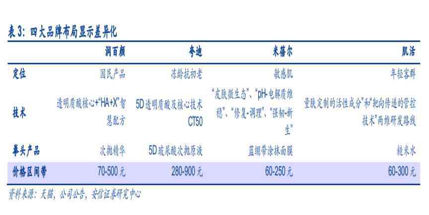 比如,公司大护肤单品“润百颜”系列产品采用“透明质酸核心+X”的智慧配方,产品对敏感肌、干皮、抗皱、美白等方面具有明确的功效。第二大单品夸迪采用“5D透明质酸及核心技术 CT50”主攻抗衰;第三大单品米蓓尔主攻敏感肌问题;第四大单品肌活瞄准注重性价比的年轻消费群体。