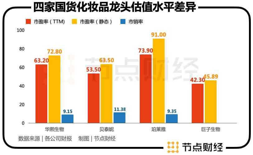 节点财经整理发现,不论是静态市盈率,还是市盈率(TTM),珀莱雅均是最高的。