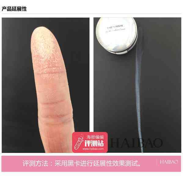 评测结果:采用黑色卡纸进行延展性效果测试,手指轻抹粉霜均力在卡纸上滑动,粉霜细腻,延展程度有15厘米左右,延展性比较好,涂抹的时候不容易卡粉。