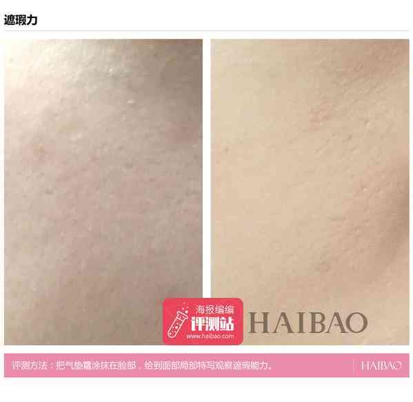 评测结果:婷美小屋水亮焕采气垫BB霜的遮瑕效果也很好,亲肤效果极佳,脸部使用前毛孔较为粗大,有细小斑点,皮肤略显粗糙,使用后,轻薄细腻的霜体与肌肤完美贴合,斑点、瑕疵、毛孔有明显减少,肤质明显变光滑。