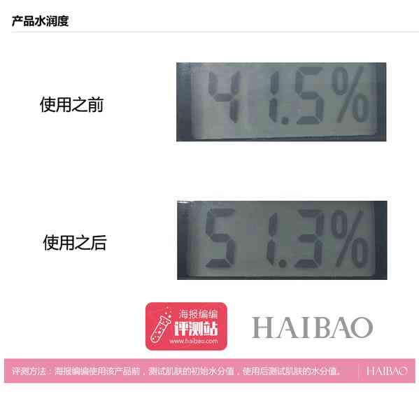 评测结果:使用此款婷美小屋水亮焕采气垫BB霜前,测得编编的脸部肌肤的水分值为41.5%,肌肤表现出较干燥、缺水的状态;使用气垫霜1小时后,测得肌肤水分值为51.3%,上升了9.8%,水分值上升,肌肤的滋润度得到大幅度的提升,证明其能为肌肤锁水保湿,让肌肤在较长时间内达到水油平衡的状态,是一款非常保湿的气垫BB。