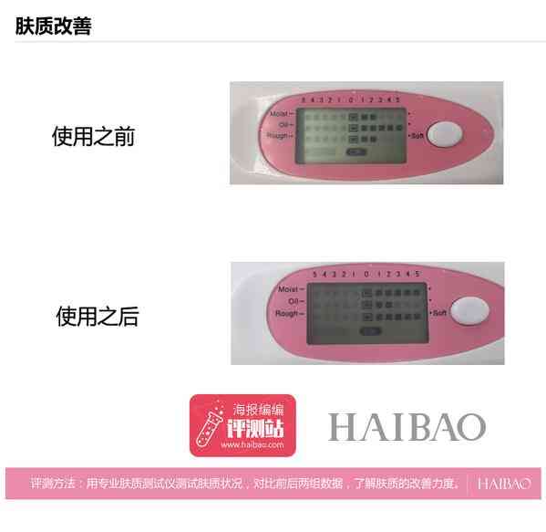 评测结果:使用前,测得肤质的各项数据为水2,油5,细腻度3,肌肤缺水油腻,水油极度不平衡,肤况不佳。使用此款气垫霜后,重新测得数据为水5,油2,细腻5,肌肤的含水量得到较大提升,油腻感减轻,肌肤水油获得平衡,肌肤的细腻度的提升也非常明显,变得柔亮细嫩,肤质改善效果佳。