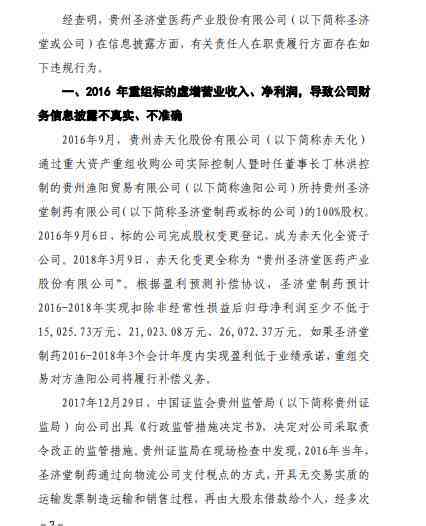 2016年9月,贵州赤天化股份有限公司(以下简称赤天化)通过重大资产重组收购公司实际控制人暨时任董事长丁林洪控制的贵州渔阳贸易有限公司(以下简称渔阳公司)所持贵州圣济堂制药有限公司(以下简称圣济堂制药或标的公司)的100%股权。2016年9月6日,标的公司完成股权变更登记,成为赤天化全资子公司。2018年3月9日,赤天化变更全称为“贵州圣济堂医药产业股份有限公司”。