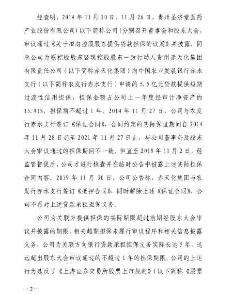 然而,2014年11月27日,圣济堂与农发行赤水支行签订《保证合同》,合同约定的实际保证期间自2014年11月28日起至2021年11月27日止,与公司董事会及股东大会审议通过的担保期间不一致。直至2019年11月2日,经监管督促后,圣济堂才进行核查并在临时公告中披露上述实际担保合同内容。