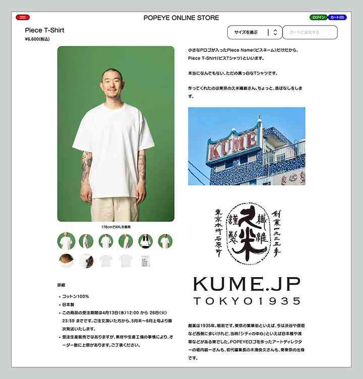 而且,不同于其他卖 logo T 恤却忽视品质的店家,POPEYE 在品质上也不敢砸了自家招牌,面料选用了 1935 年就创立的久米纺织工业(KUME.JP)的高品质产品,久米纺织也一直被誉为「日本最擅长做 T 恤」的公司。