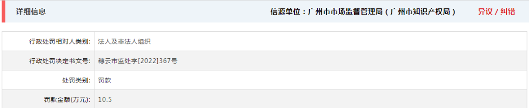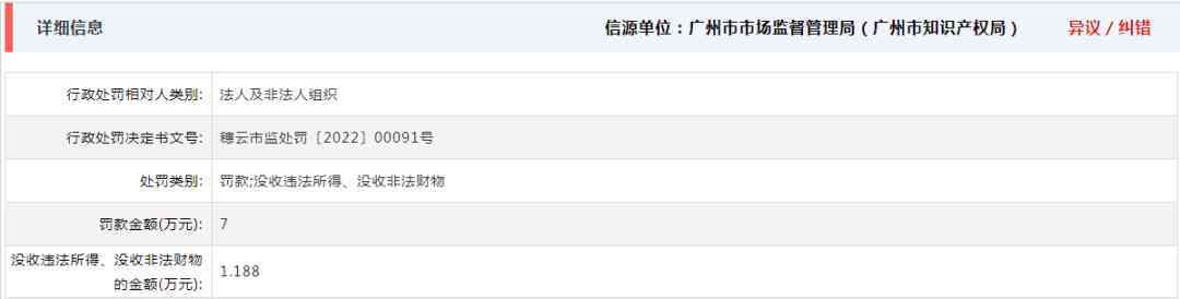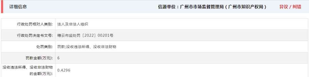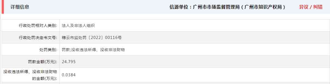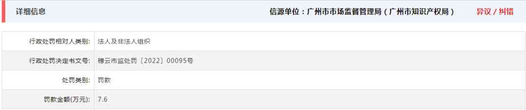 4月19日,信用广州发布的公示显示,因涉嫌对侵犯他人注册商标专用权行为,广州市美度化妆品有限公司被处罚款7.6万元。